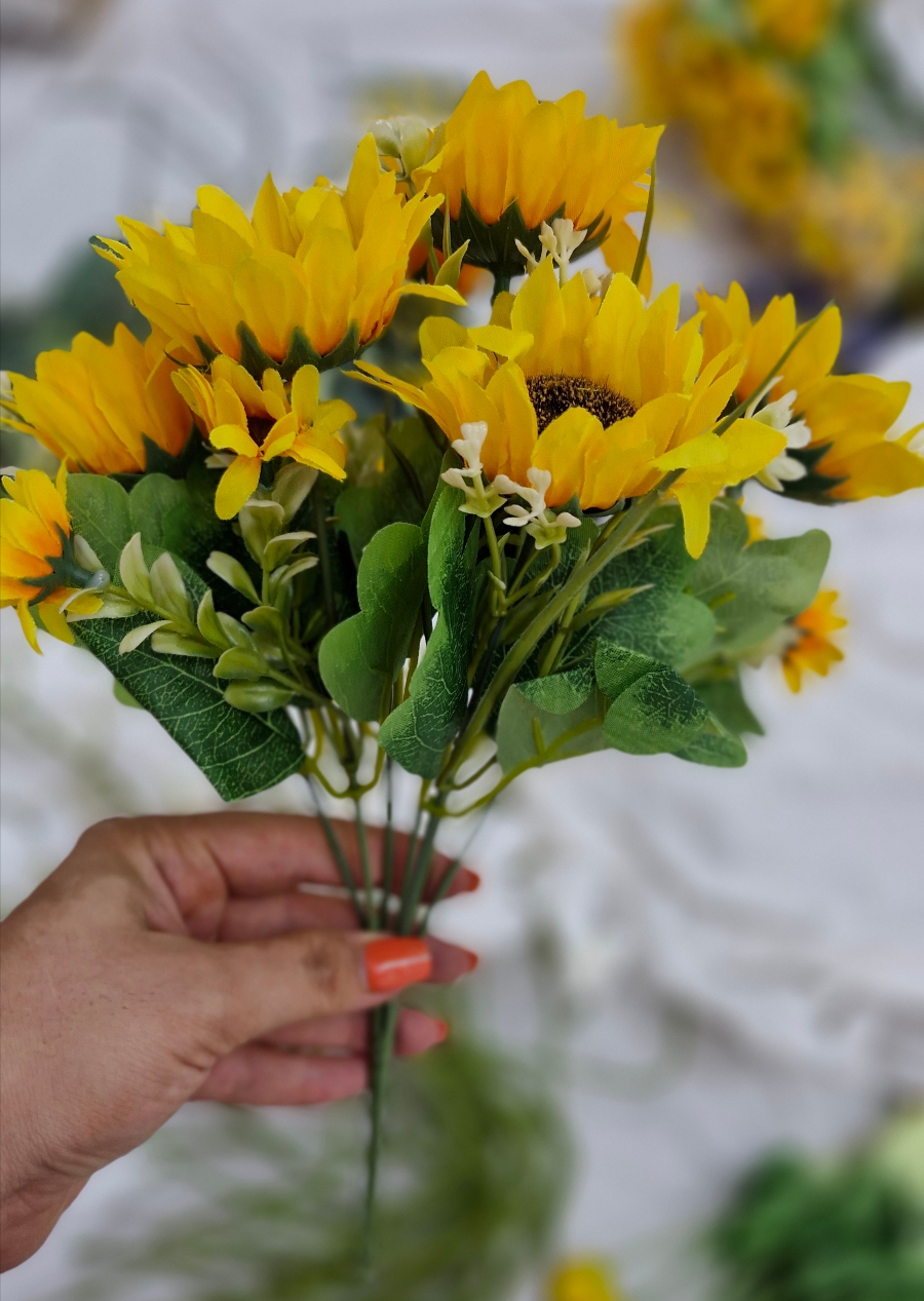بوته گل مصنوعی آفتابگردان با طراحی شاد و چشمنواز، انتخابی عالی برای ایجاد حس گرما و انرژی در دکور منزل است. این بوته شامل ۴ گل اصلی آفتابگردان بههمراه ۹ شکوفه ظریف است که باعث شده حجم و زیبایی کار چند برابر شود.